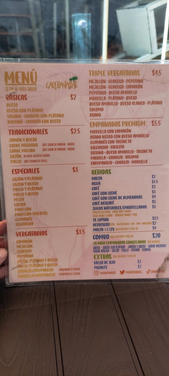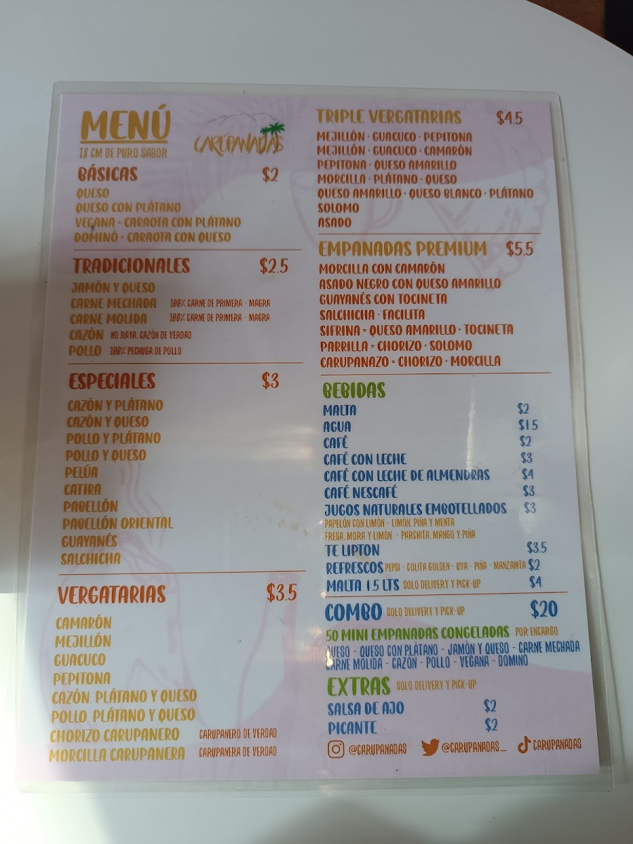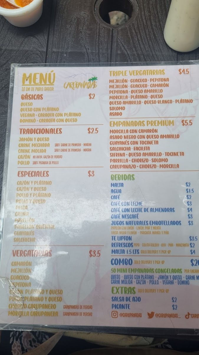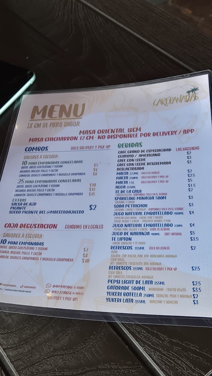 The menu also makes smart use of combos and drinks to round out the experience. Options like ¡Exclusiva Para Ti!: 2 Empanadas Tradicionales + Malta and Promos del Mes: 4 Empanadas Tradicionales + 2 Maltas are practical and appealing, especially when paired with beverages such as Malta No Retornable Maltín 250 ml, Jugo de Piña, Limón y Menta 350 ml, Agua de 355 ml, and Malta Maltín Polar 1.5 L. Overall, the menu feels complete and well-balanced, leaving the impression that Carupanadas Caracas knows exactly how to honor tradition while still offering variety and value.