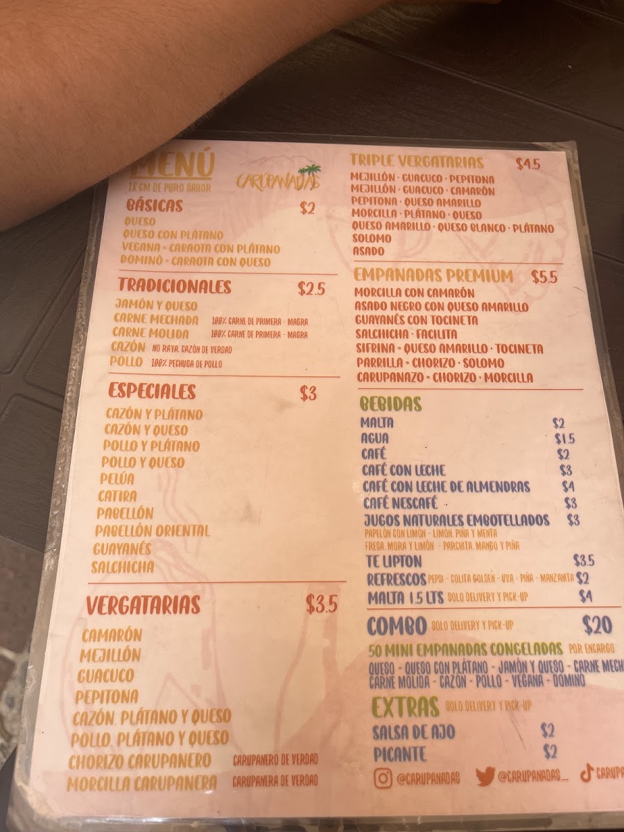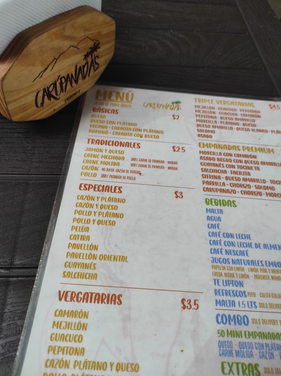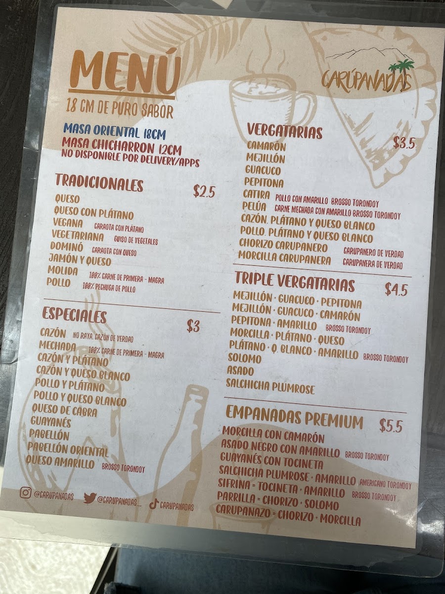 The menu also makes smart use of combos and drinks to round out the experience. Options like ¡Exclusiva Para Ti!: 2 Empanadas Tradicionales + Malta and Promos del Mes: 4 Empanadas Tradicionales + 2 Maltas are practical and appealing, especially when paired with beverages such as Malta No Retornable Maltín 250 ml, Jugo de Piña, Limón y Menta 350 ml, Agua de 355 ml, and Malta Maltín Polar 1.5 L. Overall, the menu feels complete and well-balanced, leaving the impression that Carupanadas Caracas knows exactly how to honor tradition while still offering variety and value.